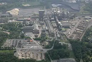 Комплекс поверхні складається з трьох основних блоків: головного (скіпового) стовбура, допоміжного (клітьового) стовбура, адміністративно-побутового комбінату (АБК) та окремо розташованих будівель і споруд, які за своїми технологічними та спеціальним вимогами не можуть бути зблоковані. До них належать: склади, збагачувальна фабрика або установка[1],головна поверхнева електропідстанція, резервуар для води, естакада, градирня та ін.