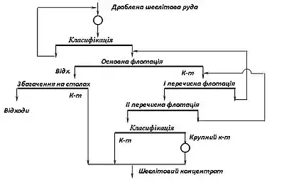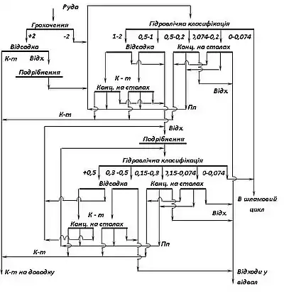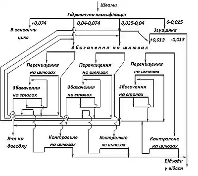При збагаченні крупних класів застосовується відсадка, дрібних – концентрація на столах. В більшості випадків для одержання бідних відвальних відходів крупні фракції відходів необхідно подрібнювати і повторно збагачувати, тому що при тонкому вкрапленні вольфраміту в пустій породі розкриття зростків досягається при більш тонкому подрібненні. Якщо в руді поряд з крупновкрапленим вольфрамітом є значна кількість тонковкраплених мінералів, що потребує більш тонкого подрібнення, в технологічній схемі необхідно передбачити цикл операцій для переробки шламів (рис. 3).