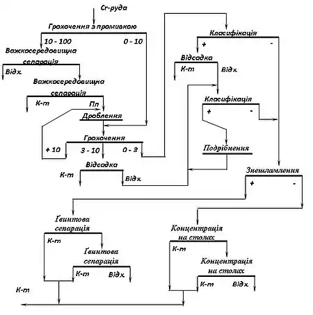 На рис. 1 наведена схема збагачення бідної руди з вмістом триоксиду хрому близько 39 %. Основний рудний мінерал — хромшпінелід, нерудний — серпентин.