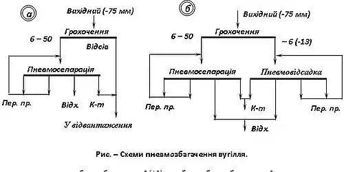 Пневмосепарація дозволяє переробляти матеріал крупністю 6—50 або 13—75 мм, пневмовідсадка — крупністю до 13 мм. Технологічні схеми відрізняються простотою. Для вугілля легкої збагачуваності з малозольним дріб'язком може бути застосована схема з глибиною збагачення 6 або 13 мм (рис. а). Крупний клас + 6 (+13) мм збагачується в пневмосепараторах, а дрібний — 6 (–13) мм приєднується до концентрату в незбагачуваному виді. Пневматичне збагачення простіше і дешевше гідравлічного, але ефективність його значно нижча.