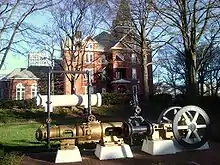 Як найстаріша будівля Технічного кампусу інституту Техно Вежа накопичила багато монументів за роки існування. Всі монументи подаровані інституту його випускниками. Дві доріжки для прогулянок проходять навколо інституту — їх подарували випускники на п'ятидесятиріччя випуску. Перший випуск 1903 року подарував мармуровий питний фонтанчик, він знаходиться біля головного входу. А також там є пара мармурових лавок, подарованих випуском 1925. Поруч з лавками стоїть мармуровий меморіал в пам'ять про Паула Ховенса — випускника інституту та колишнього президента Американської асоціації цивільних інженерів він зник під час Катастрофи на кораблі 8 травня, 1925. А також, Паровий компресор повітря, відомий, як «паровий двигун» розташований на горбі біля школи і служить, як нагадування про індустріальне минуле інституту.[2][3]