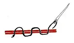 Двобічна штапівка, виконується технікою "вперед голку". Спочатку зліва на право набирають непарну кількість ниток основи, а на зворотньому шляху наносять поперемінно в проміжках то з лицевої то з виворотньої сторони стібки. Варіантами цього стібка є решітка, клітка, ямочки.