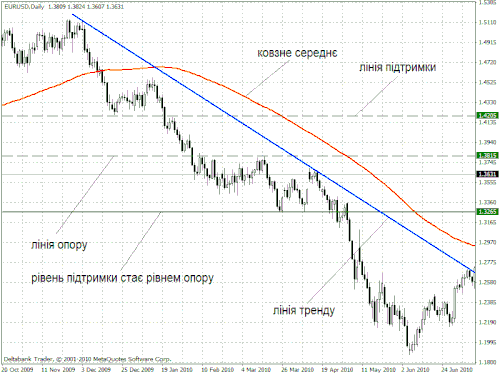 - Лінії та рівні підтримки (support) і опору (resistance);