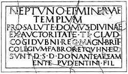 Для Нептуна і Мінерви, на благо Божественного Дому, владою Тіберія Клавдія Когідубнія, великий король бритів, Гільдія ковалів і тих, хто дав цей храм за свій рахунок … (громадян), син Пудентінія, представив зовнішній двір.