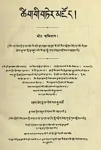 | Офіційна китайська транслітерація | Zhopamii riggyü yongla gyê zamnyinai qê tong tang/ Tobtang ki rangwang zhanyam tu yoi la/ Kong cor rangqungki lozai tang samcü sangbo doin bai oipab gyang yoi/ Têxin paincün jigkijigla pubünkyiduxê zinbai qajoi gyang laglêndar goibayin// |
