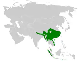 Вид поширений в Східній, Південно-Східній Азії та у Гімалаях. Ареал простягується від Непалу до тихоокеанського узбережжя Китаю на південь до В'єтнаму, далі трапляється мозаїчно аж до острова Тимор. Мешкає у тропічних і субтропічних низинних і гірських дощових лісах.