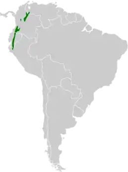 Вид поширений в Андах на півночі Перу, в Еквадорі, Колумбії та на заході Венесуелі. Населяє гірські вологі ліси на висоті 1700-3350 м над рівнем моря.