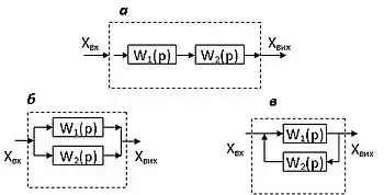 Неважко бачити, що при послідовному з’єднанні ланок (рис. а) передавальна функція загальної (підсумкової) ланки дорівнює добутку передавальних функцій елементарних ланок, а при паралельному з’єднанні (рис. б) – сумі передавальних функцій. Зустрічно-паралельне включення (рис. в) часто називають з’єднанням з обхватом ланки зворотним зв’язком.