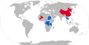 Карта країн операторів Type 62. Червоним позначено колишніх операторів, синім позначено країни, в яких танк стоїть на озброєнні дотепер.