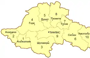 | 7 | Телавський | Телав (13 929 осіб) | 2974,5 | 66 767 |