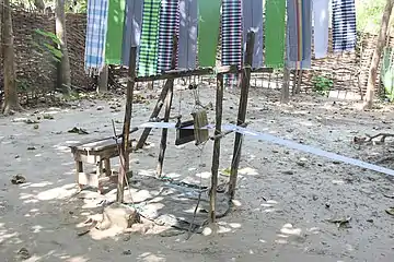 - Начиння, ремізки (діал. «ничениці», «нечілниці», «нити») — пристрій для піднімання й опускання ниток основи. Являє собою нитяні рукави, натягнуті на паралельно розміщені дерев'яні пластинки (шохти, у Галичині шофти, ціпки). У рукавах зроблені вічка, через які і проходять нитки основи, при цьому парні нитки проходять через вічка першого рукава-ремізки, а непарні спочатку проходять через нитки першої ремізки, потім — через вічка другої. Верхні пластинки начиння мотузками підвішуються через скраклі до скракника, нижні — мотузками з'єднуються з педалями. Від кількості ремізок залежить візерунок тканини, для простого переплетіння досить двох: одної для парних, другої — для непарних ниток основи[7]. Для в'язання начиння використовували спеціальний прилад — стілець чи лавку[8]. У складних переплетеннях число ремізок сягає 30.
