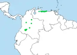 Вид поширений на північному заході Південній Америці. Трапляється на Прибережному хребті на півночі Венесуели та в колумбійські Андах.