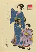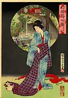A Seated Woman with a Lacquer Candle Stand (c. 1875) by Chikanobu. Wood-block print, 36.2 × 23.8 cm (14.25 × 9.37 in). Collection of Brooklyn Museum