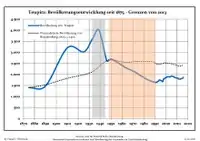 Динаміка населення з 1875 року в сучасних кордонах (Синя лінія: населення; Пунктир: відносна порівняльна динаміка населення землі Бранденбург; Сірий фон: період Третього рейху; Помаранчевий фон: період НДР)