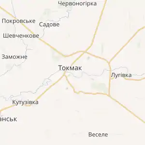 Токмак розташований за 98 км від обласного центру, автошлях Н30 та E105.