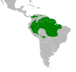 Вид поширений в Центральній та Південній Америці від Коста-Рики до крайнього північного Парагваю. Природним середовищем існування є низинний тропічний або вологий субтропічний ліс на висотах до 1200 м над рівнем моря.