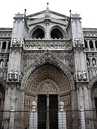 Головний фасад має три портали, відомі як, відповідно, портал Прощення (Puerta del Perdón, по центру), портал Страшного суду (Puerta del Juicio Final, справа) та портал Пекла (Puerta del Infierno, зліва). Будівництво порталу Прощення було розпочато під керівництвом Альвара Мартінеса 1418 року. Він отримав цю назву тому, що індульгенції дарувались тим, хто проходив крізь нього. Зараз він майже завжди замкнений та відкривається лише за особливих обставин, у тому числі при призначенні нових архієпископів. Він має одну велику арку з шістьма готичними архівольтами. Орнамент складається типовою готичною іконографією, з фігурою Спасителя у біфорії та апостолами у одвірках. У тимпані Діва Марія дає казулу святому Ілдефонсусу, що є особливим саме для цього собору і повторюється всередині каплиць та на картинах. Створки дверей мають більше 5 метрів у висоту та покрити орнаментованими бронзовими плитами, які датуються 14-м ст.