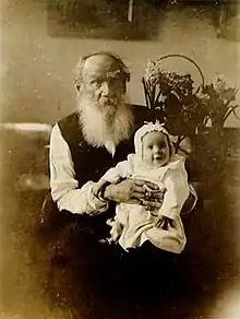 Лев Микола́йович Толсто́й[10] (рос. Лев Николаевич Толстой; 28 серпня (9 вересня) 1828, с. Ясна Поляна, Тульська губернія, Російська імперія — 7 (20) листопада 1910, станція Астапово, Рязанська губернія) — один із найвідоміших російських письменників і мислителів. Брав участь в обороні Севастополя. Просвітник, публіцист, релігійний мислитель, його авторитетний погляд послужив причиною виникнення нової релігійно-моральної течії в Росії — толстовства. Член-кореспондент Імператорської академії наук (1873), почесний академік за розрядом красного письменства (1900).