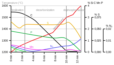 Після завантаження у конвертер вапна у нього заливають рідкий чавун з температурою 1120–1250 °C, перевертають конвертер у вертикальне положення й починають продування. На початку продування окислюються кремній Si, марганець Mn, і частково залізо Fe, вуглець С і фосфор Р. Продування металу проводять до вмісту 0,05% вуглецю С, бо тільки на кінець окислення вуглецю починається інтенсивне окислення фосфору Р, який окислюють до 0,04 — 0,05%. Сірка S вигорає лише наприкінці процесу і тільки частково. Томасівський процес відбувається з виділенням великої кількості тепла, тому під час його проведення метал часто доводиться охолоджувати додаванням руди, окалини, скрапу. Наприкінці плавки метал розкислюють і навуглецьовують коксом, графітом, термоантрацитом або деревним вугіллям. Вихід металу становить 85 — 89%, вихід шлаку — 18 — 20% від маси металу. Залежно від ємкості конвертеру, що становить 18 — 70 т, тривалість продування становить 16 — 22 хвилини, тривалість всієї плавки — 25 — 40 хвилин.