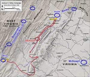 Весною 1862 р. Потомакська армія генерала Макклелана висадилася на Вірджинському півострові та почала наступ на Річмонд, відомий як кампанія на півострові. Корпус Макдауелла знаходився в районі Манассаса, а загін Натанаеля Бенкса увійшов в долину Шенандоа. Джексону було доручено діяти в долині, щоб не пропустити Бенкса на південь і по можливості не дати Макдауеллу з'єднатися з Макклеланом. Дуглас Фріман помічав, що становище Півдня наприкінці квітня складалося дуже небезпечно: якби Бенкс та Фрімонт зв'язали Джексона та Юелла в долині, то армія Макдауелла змогла б легко прорватися до Річмонда[51].