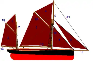 Трикутний топсель підіймається на фалі за фаловий кут, трапецієподібний (люгерний) — на рейку, прикріпленому до фала за третинну стропку.