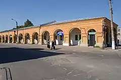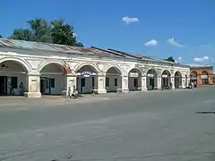 Цегляна споруда, з двох ідентичних будівель в стилі зрілого класицизму. Будівлі являють собою східний і західний корпуси, витягнуті по одній осі уздовж вулиці Базарної (східний корпус: вул. Базарна, 2; західний корпус: вул. Базарна, 4). Перекриті склепіннями, дах чотирьохсхилий, вкритий залізом. Під спорудою - підвал зі склепінчастими перекриттями, до нього ведуть цегляні сходи. Фасади оформлені по-різному. Східний, головний - у вигляді галереї-аркади, в довжину має 100 м. Арки різнопрольотнї (кутові вже й нижче за інших, всі з напівциркульними перемичками, мають профільоване обрамлення), спираються на пілони, декоровані прямокутними нішами. У тимпанах між арками - трапецієподібні фільонки. Пілони на рівні імпостів профільовані і з'єднані металевими зв'язками. Цоколь також профільований. На головній фасадній стіні під аркадою розміщені прямокутної форми віконні та дверні прорізи з прямокутними сандриками над ними. Західний фасад вирішено більш стримано, у довжину вдвічі коротший за східний, стіни його розчленовані міжповерховим карнизом на два яруси, ритмічно розташовані віконні та дверні прорізи об'єднані напівциркульною нішею, фасад завершується багатопрофільним карнизом. Пам'ятка належить до зразків цивільної архітектури періоду зрілого класицизму.