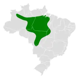Поширений в бразильській Амазонії на південь від річки Амазонки, від східного берега річки Мадейри до верхів'їв річки Шінгу. Населяє густий підлісок та узлісся вологих лісів Амазонії на висоті нижче 1000 м.