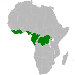 Вид поширений в Західній та Центральній Африці. Трапляється від Гвінеї до Уганди та на південь до Анголи. Мешкає у сухих та вологих лісах та саванах.