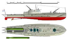 4 поперечними водонепроникними перегородками корпус розділений на 5 відсіків: I — форпік; II — моторний; III — відсік керування; IV — паливний; V — жолобні торпедні апарати (ТА). Екіпаж за штатом - 6 осіб (практично іноді доходив до 11 осіб).