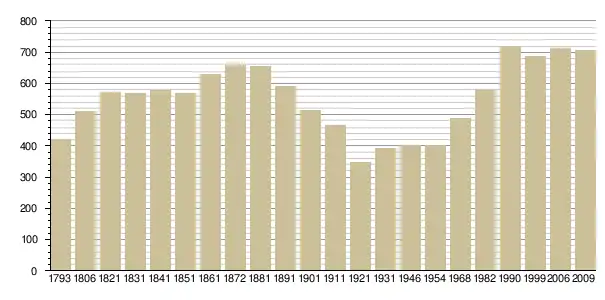 Динаміка населення (base Cassini de l'EHESS pour les nombres retenus jusque 1962[3], base Insee à partir de 1968 (population sans doubles comptes puis population municipale à partir de 2006)[4] · [5] ):