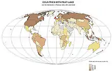 Світові запаси торфу оцінюються від 250 до 500 млрд т, площа торфових родовищ світу становить 176 млн га. Торф'яники вкривають близько 3 % поверхні земної суші або від 3,850,000 до 4,100,000 км². З цих трьох відсотків близько 7 % знаходяться в промисловій розробці. Родовища торфу виявлені на всіх континентах. Великі запаси торфу є в Росії, Канаді, США, Індонезії, Ірландії, Фінляндії, Білорусi, Польщі, Китаї, країнах Балтії, Індонезії, Фінляндії, Швеції. Більшість торф'яних покладів (близько 80 %) розташовані у верхніх широтах; близько 60 % всіх заболочених територій в світі мають запаси торфу[1].
