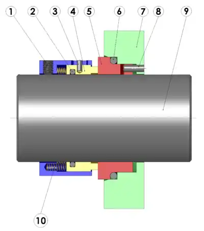 Ординарне торцеве ущільнення. Конструктивно торцеве механічне ущільнення включає основне ущільнення і допоміжні (рухомі і нерухомі) ущільнення, які знаходяться в контакті з середовищем, що ущільняється, дозволяючи обертовому елементу пройти через камеру ущільнення. Основне ущільнення — це пара тертя двох кілець (рухомого і нерухомого) з різних матеріалів (вуглеграфіти, метали, карбіди: карбід вольфраму з різними зв'язками, карбід кремнію, кераміка, пластмаси), як одного і того ж матеріалу так і в поєднанні різних матеріалів (нержавіюча сталь — вуглеграфіт, кераміка — вуглеграфіт). Для забезпечення необхідного контакту між кільцями застосовуються пружина, блок пружин або пружний сильфон. У процесі експлуатації на торцеві поверхні діють гідравлічні сили і при позитивно тиску середовища, що ущільняється намагаються стиснути пари тертя, що збільшує тепловиділення. Теоретично зазор між ущільнюючими поверхнями рівний висоті шорсткості цих поверхонь і не перевищує 1 мкм.