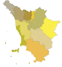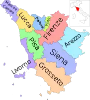 | Провінції | Ареццо, Флоренція, Ґроссето, Ліворно, Лукка, Масса-Каррара, Піза, Пістоя, Прато, Сієна | ||||