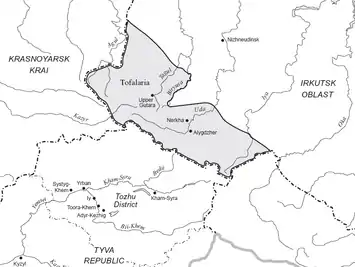 Тофалари населяють вкриті тайгою північні схили Східного Саяну в басейні верхів'їв річок Бірюси, Уди, Кана, Ії, Гутари у декількох національних і напівнаціональних поселеннях.