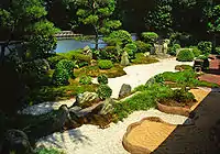 - Західний сад являє собою поєднання кущів азалій, сформованих у вигляді низьких паралелепіпедів з квадратною основою, окремих посадок чагарників і садових бонсай на щебеневому «полі» і «газонів» з моху.
