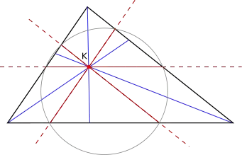 - Якщо симедіани продовжити до повторного перетину з описаним колом трикутника в точках , то точка K залишиться точкою Лемуана для трикутника .