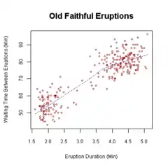 - Наприклад, для відображення значення «ємність легень» (перша змінна), і часу, що показує на скільки довго людина може затримати дихання, дослідник вибрав би групу людей для дослідження, потім виміряв би об'єм легенів кожного з них (перша змінна), і час, протягом якого людина змогла затримати дихання (друга змінна). Дослідник потім побудував би діаграму розсіювання з «ємністю легень» по горизонтальній осі, і «час затримання дихання» по вертикальній осі. Людина з легенями ємністю 400 мл, яка може затримати повітря на 21,7 секунд буде представлена однією точкою на діаграмі розсіювання в точці (400, 21.7) в декартових координатах. Точкова діаграма всіх людей в дослідженні дозволить досліднику отримати наочне порівняння двох змінних з набору даних, і допоможе визначити співвідношення між двома змінними.