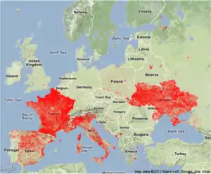 Точкова картограма: геокодовані статті україномовного розділу Вікіпедії на території Європи станом на 2012 рік.