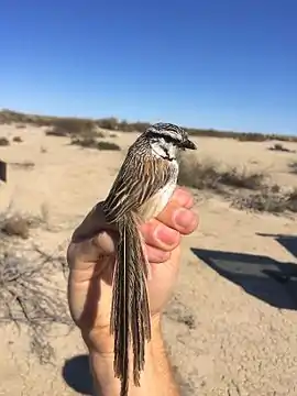 Дрібний птах, завдовжки від 18 до 20 см, з розмахом крил приблизно 21 см і вагою від 15 до 23 г. Має довгий хвіст, довший за тіло. Основне забарвлення імбирно-коричневе зі світло-сірими смугами. Лицьова частина голови та горло білого кольору. Через око проходить чорна смуга у вигляді маски (звідси і назва виду). Ще одна чорна смуга підкреслює щоки. Живіт рудувато-коричневий. Дзьоб міцний, чорного кольору.