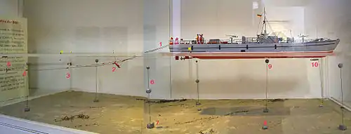 1 — буксир, 2 — заглиблювач, 3 — траляча частина з різаками, 4 — відтягувач буя, 5 — буй-параван, 6-10 різні типи морських мін