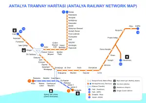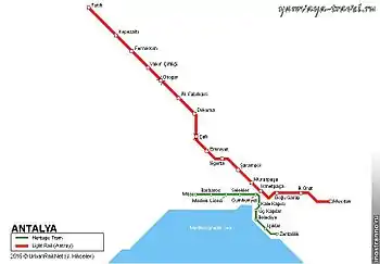 Трамвайна мережа Анталії складається з одноколійної прибережної лінії (з трьома роз'їздами). Ширина колії — 1435 мм.