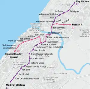 Мережа загальною протяжністю 26 км з 43 зупинками має дві лінії (1 і 2) (Включає два маршрути, що проходять спільною центральною дистанцією. Довжина маршруту складає 1 - 11,7 км, маршруту 2 - 7,8 км. Інтервали на кожному маршруті в години пік складають 8 хвилин.), розрахована на пасажиропотік 172,000 пасажирів на день. Мережа експлуатується Veolia Transdev з Alstom Citadis. Потяги складаються з п'яти зчленованих вагонів. Лінія прямує через новий міст Хасана II (завдовжки 1215 метрів) над Бу-Регрег і проходить поблизу залізничної станції Гар де Рабат-Віль через спеціально прокладений отвір в мурі середньовічного міста. Планується до 2018 року ввести до експлуатації ще дві лінії (3 і 4)