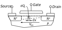 де густина струму, а товщина інверсійного каналу. Оскільки густину струму можна представити у вигляді (чисто дрейфовий струм):