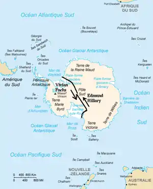 З іншого боку Антарктиди у протоці Мак-Мердо Гілларі заснував базу Скотт, яка мала бути пунктом призначення експедиції. Задачами цієї частини експедиції були: дослідження безпечного маршруту для команди Фукса та розміщення запасів на їх шляху по Полярному плато. Команда Гілларі справилася з задачами і вирішила самостійно дістатися південного полюсу, де нещодавно була встановлена станція Амундсен-Скотт. Це була третя після Амундсена та Скотта наземна експедиція, що досягнула Південного полюсу.