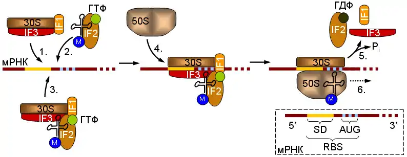 Початкова стадія передбачає зв'язування малої рибосомної субодиниці (30S) з мРНК. Це може відбуватися двома способами: або спочатку до мРНК приєднується комплекс, що містить рибосомну субодиницю (1), а потім до нього притягується тРНК в комплексі з IF2 і ГТФ (2), або 30S-субодиниця спочатку зв'язується з тРНК, а вже потім сідає на мРНК (3). До комплексу, що утворився, приєднується велика (50S) рибосомна субодиниця (4), фактори ініціації від'єднуються від 30S-субодиниці, що супроводжується гідролізом ГТФ білком IF2 (5) і зібрана рибосома починає елонгувати ланцюжок (6).