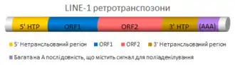 Ретротранспозони — це мобільні генетичні елементи, що застосовують метод «копіювати й вставити» для розповсюдження в геномі тварин[17]. Принаймні 45% геному людини становлять ретротранспозони та їх похідні. Процес пересування включає проміжну стадію молекули РНК, яка зчитується з ділянки ретротранспозона, і яка потім у свою чергу використовується як матриця для зворотної транскрипції в послідовність ДНК. Новосинтезований ретротранспозон вбудовується в іншій ділянці геному.