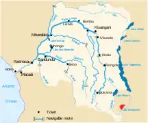 Головні річкові й озерні порти країни: Бома, Бумба, Кіншаса, Кісангані, Матаді, Мбандака на річці Конго, Кінду на річці Луалаба, Букаву і Гома на озері Ківу, Калеміє на озері Танганьїка.