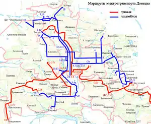 - Схема движения городского транспорта Донецка на карте (трамвай, троллейбус, автобус и маршрутки Донецка). Архів оригіналу за 28 листопада 2012. Процитовано 21 грудня 2016.(рос.)