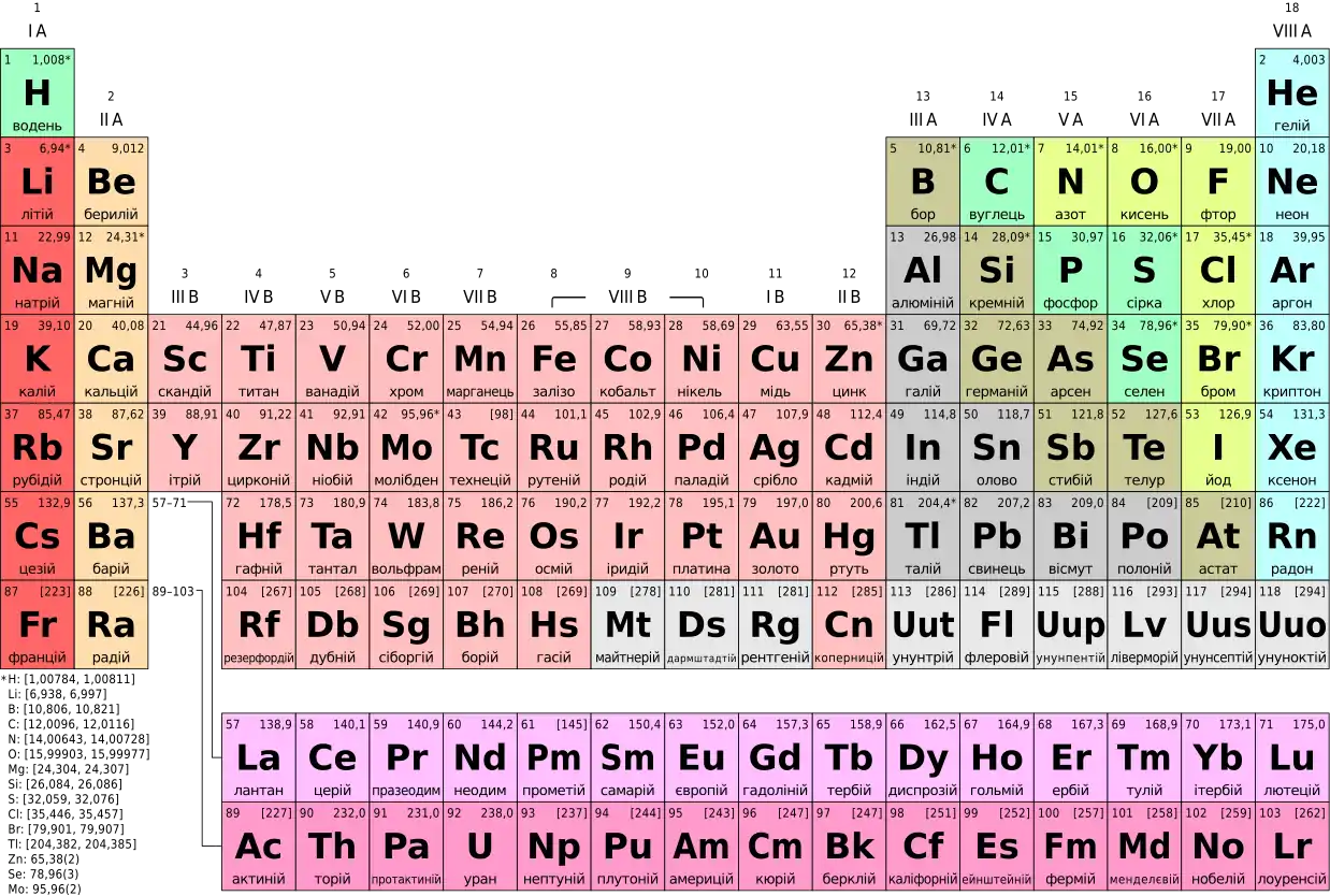 | 104 | Курчатовій | Ku | Ігор Курчатов | Резерфордій | Rf | Ернест Резерфорд | Уннілквадій | Unq |