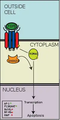 ТФРβ-1 зв'язується із рецепторами І та ІІ типу на поверхні клітини-мішені, спричиняючи об'єднання рецепторів у каталітично активний гетеротетрамер. За рахунок такого просторового зближення, рецептор Іго типу фосфорилює рецептора ІІ, активуючи його. Рецептор ІІго типу фосфорилює Smad2 та Smad3 білки, які з'єднуються з Smad4 білком, формуючи гетерогексамерний комплекс, що складається з 2ох Smad2, 2ох Smad3 та 2ох Smad4 білків. Цей комплекс активно транспортується в ядро, де зв'язується з промоторами генів-мішеней, регулюючи їх активність. Smad7 білок — це білок супресор, який пригнічує фосфорилювання білків Smad2 та Smad3, знижує їх транспорт у ядро та посилює їх деградацію. Часто білки Smad2 та Smad3 називають R-Smad-ами (від R-receptor), а Smad-7 називають І-Smad-ом (від І-inhibitor).